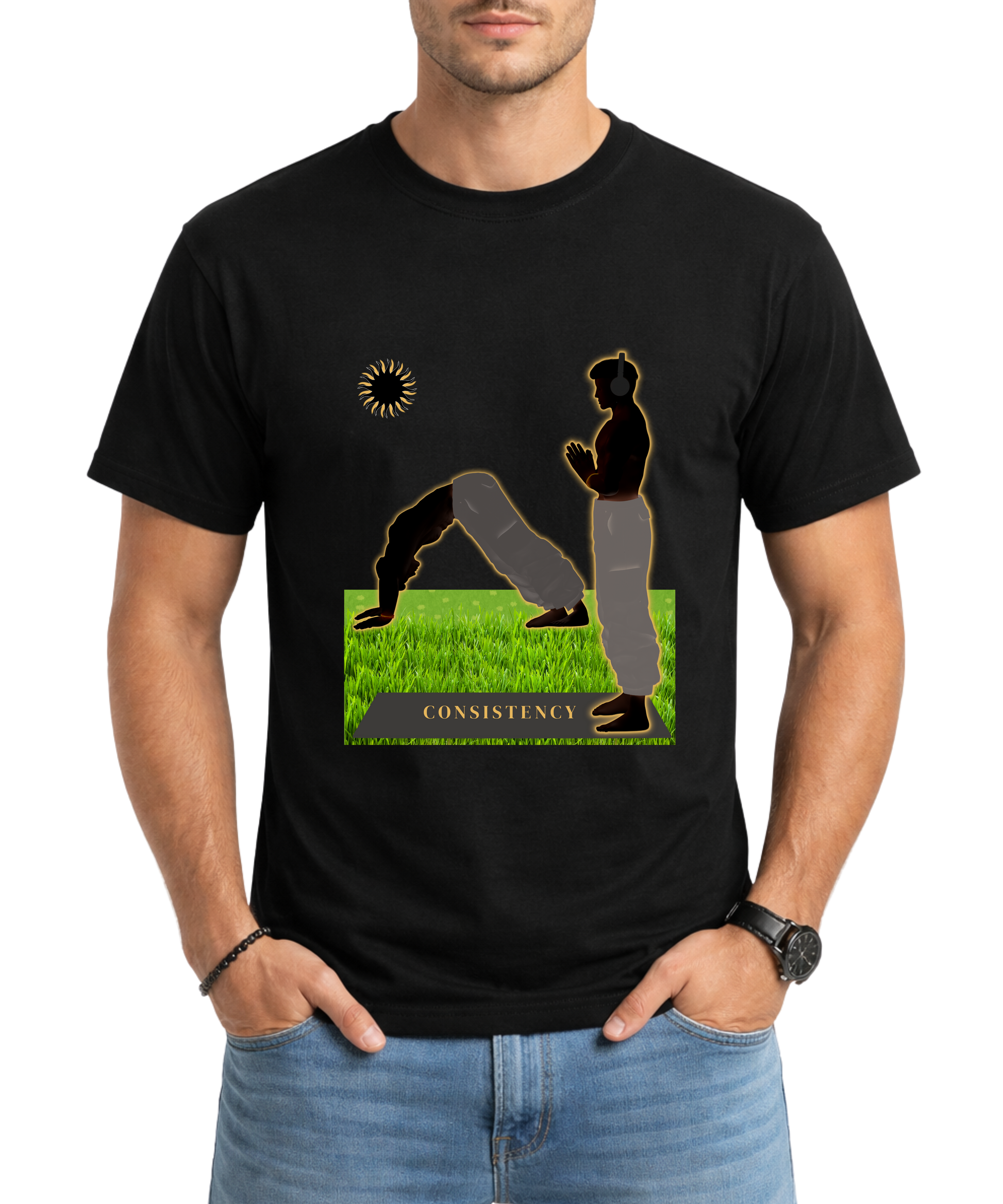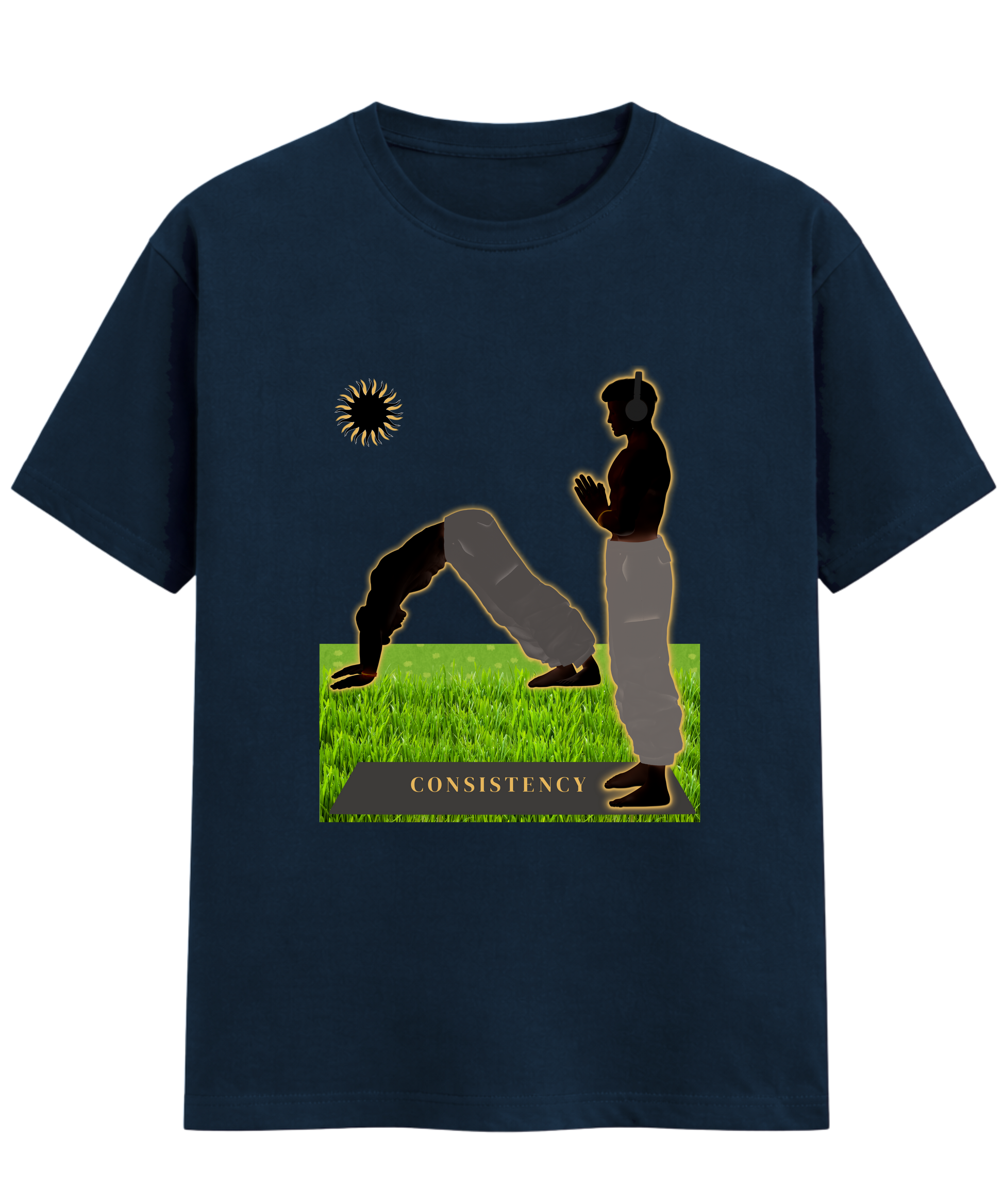 The design features a silhouette of a man performing Surya Namaskar, shown in two flowing poses on green grass with a yoga mat. A soft golden glow highlights the figure, symbolizing inner energy and awareness. The sun placed in the upper left reflects the rhythm of morning practice, while the word “CONSISTENCY” on the yoga mat reminds that yoga, like food, is a daily habit.