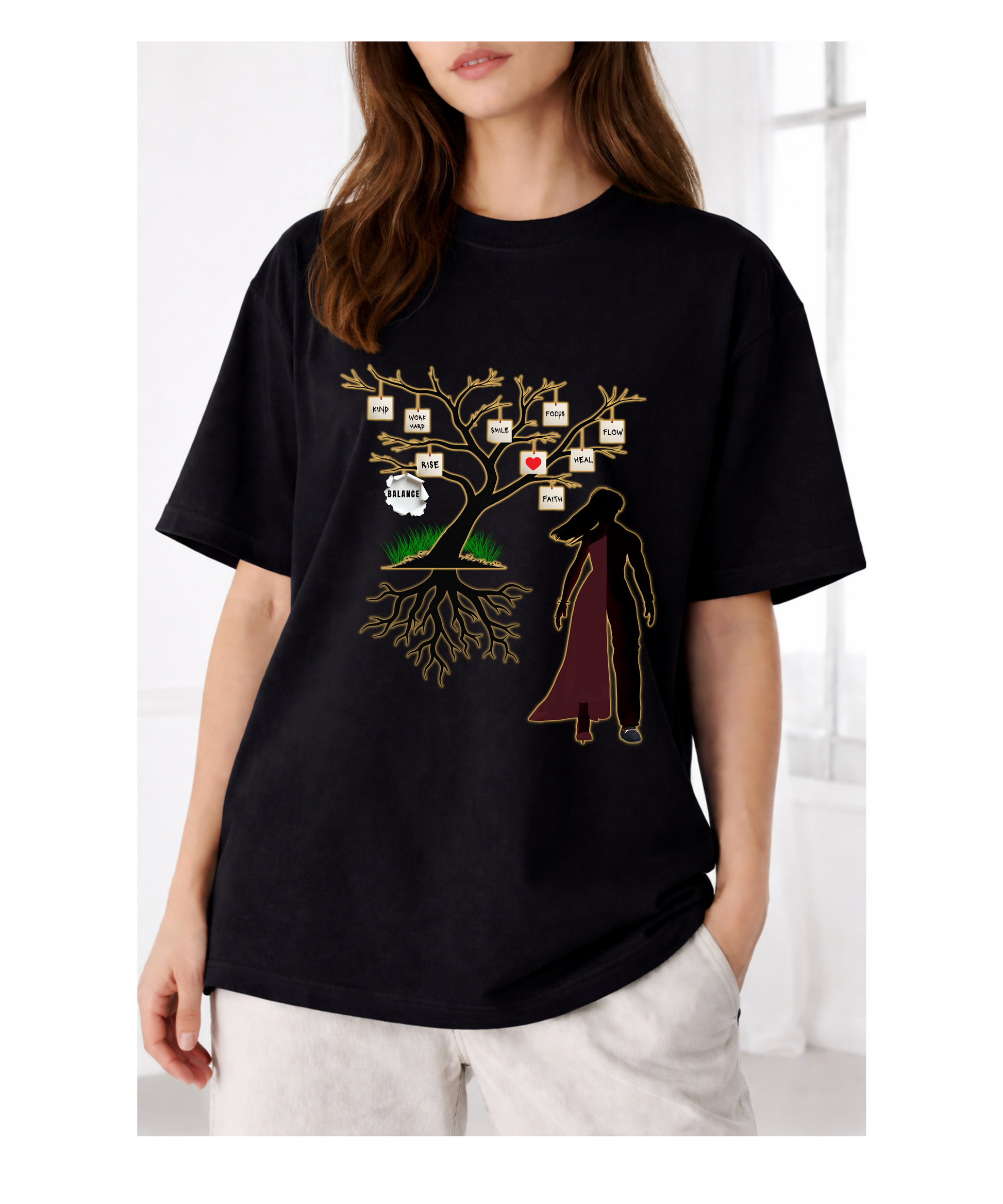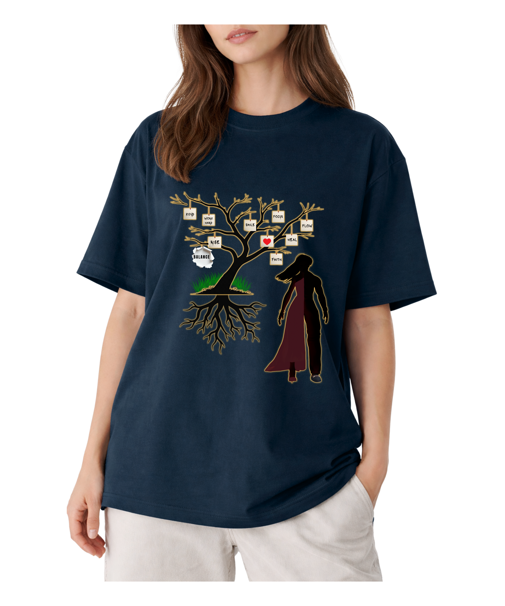 Experience the harmony of duality with this Unisex Oversized Standard T-Shirt. Featuring a silhouette tree with paper-like branches holding words like Kind and Love in a golden glow, and a half-male, half-female figure symbolizing Ardhnareshwar. Perfect for modern spirituality enthusiasts, this oversized tee ensures comfort and style for both men and women. Highlight your spiritual connection with a bold design and oversized fit.